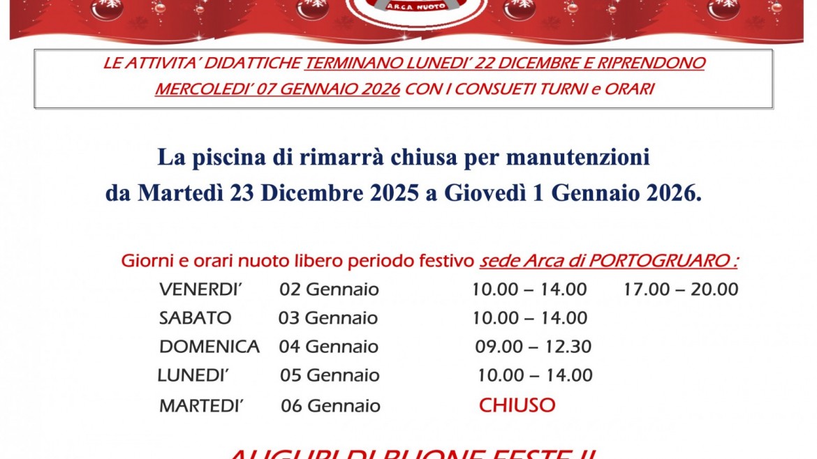 1 novembre 20/10/2025 Sabato primo novembre la piscina rimarrà chiusa (venerdì 31 ottobre e domenica 2 novembre la piscina sarà regolarmente aperta).